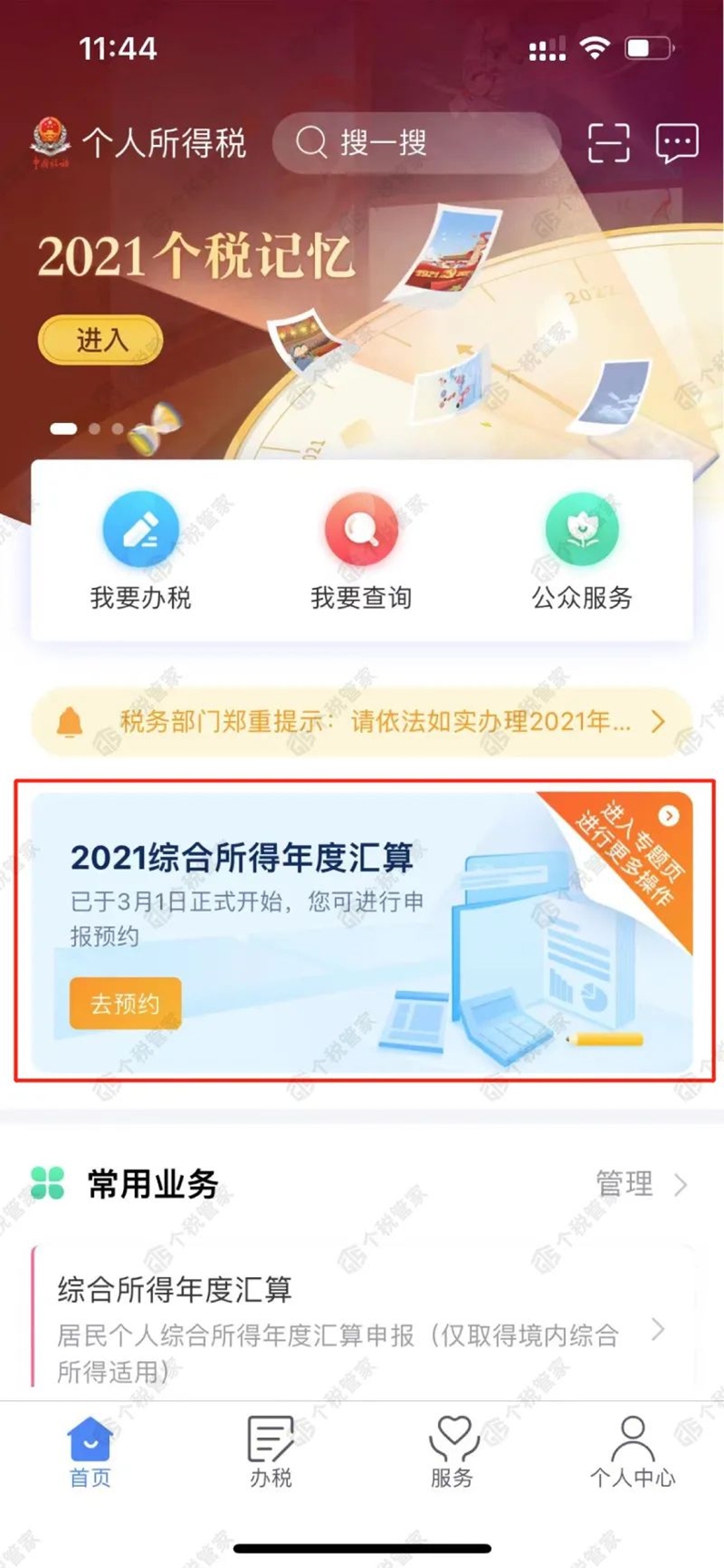 登錄個稅APP首頁,選擇【2021綜合所得年度匯算】--【去預(yù)約】。