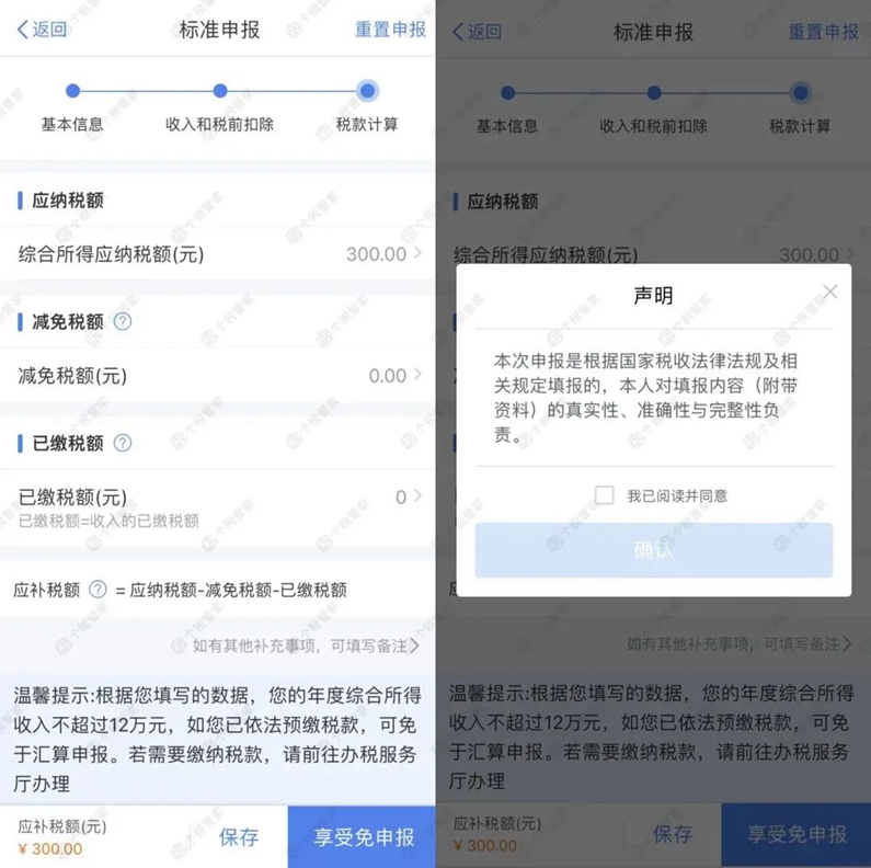 7.如果在標(biāo)準(zhǔn)申報頁面,提示有應(yīng)補稅額,在年收入不足12萬元或者補稅金額≤400元的情況下,可以點【享受免申報】。